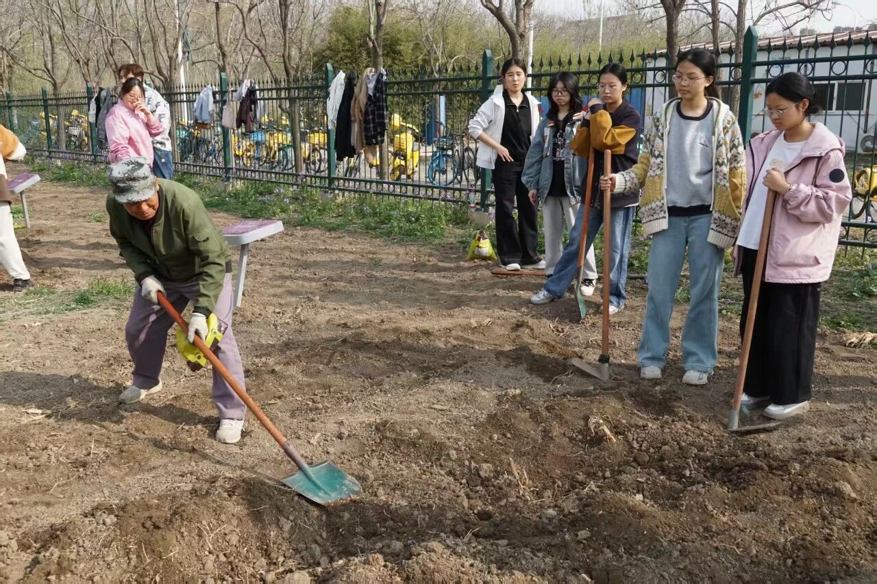 现场工作人员为同学们进行了示范,手把手教大家如何正确翻土、施肥以及清理杂草。同学们围成一圈认真观摩,随后拿起锄头和铁锹开始尝试。